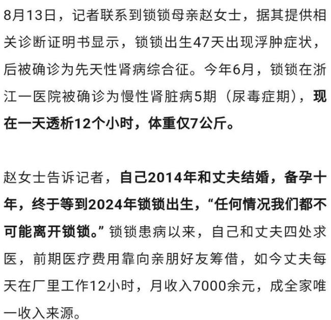 近日,有网友在社交媒体发布一条求助信息,云南文山一岁七个月宝宝“锁锁”患尿毒症,急需肾移植手术。赵女士告诉记者,在社会各界爱心人士帮助下,锁锁医疗费用已筹得四万余元,待到手术费用筹齐,赵女士将带锁锁进行配型,等待肾移植手术。