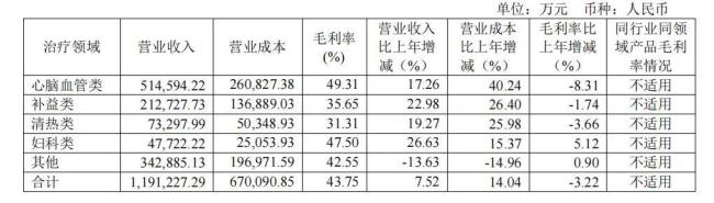 在医药工业方面,心脑血管类产品是营收支柱,涵盖安宫牛黄系列、同仁牛黄清心系列、同仁大活络系列等明星品种,2024年营收51.46亿元,占医药工业营收的43.19%,但毛利率49.31%,同比下降8.31个百分点。