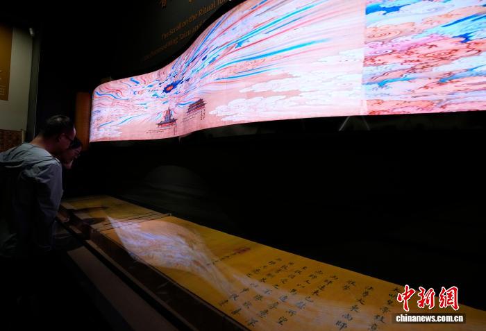 8月5日,观众正在西藏博物馆内欣赏《普渡明太祖长卷图》动态演示图。中新社记者 李林 摄