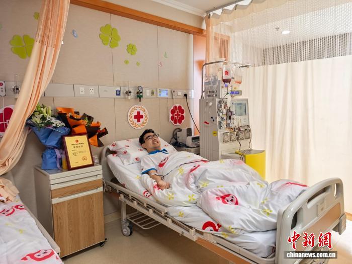 中新网杭州8月15日电(张煜欢)8月15日,在杭州某定点造血干细胞采集医院的病房里,来自浙江大学医学院附属第一医院的蔡承智医生经过4个多小时的采集,成功捐献209毫升造血干细胞混悬液,成为浙江省第1249例、杭州市第391例、上城区第63例造血干细胞捐献者。