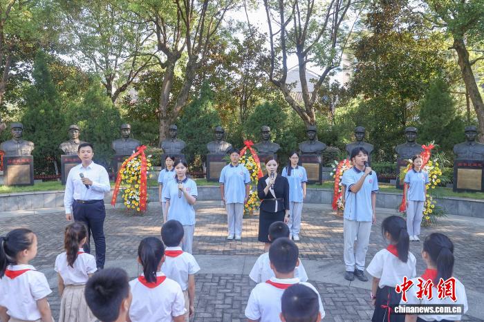 8月15日,江西南昌,南昌新四军军部旧址陈列馆举行纪念“‘8·15’日本宣布无条件投降80周年”活动,陈列馆讲解员与学生代表在新四军早期领导人铜像前朗诵诗歌《英雄》。中新社记者 刘力鑫 摄