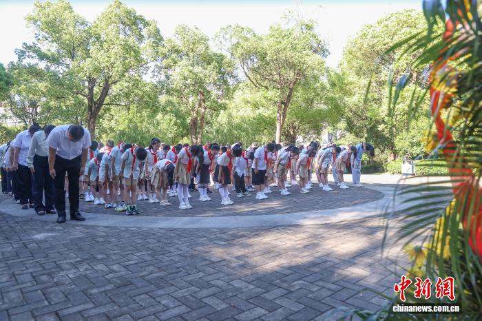 8月15日,江西南昌,南昌新四军军部旧址陈列馆举行纪念“‘8·15’日本宣布无条件投降80周年”活动,社会各界人士向新四军早期领导人铜像鞠躬。中新社记者 刘力鑫 摄