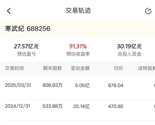 到了2025一季度末,章建平继续加仓寒武纪,持股数进一步攀升至608.63万股,持股比例为1.46%。而假设手握寒武纪的股数至今未有变动,那么其最新持股市值将达57.76亿元。