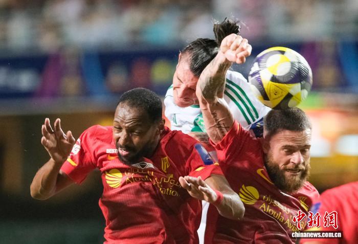 8月20日,沙特超级杯的第二场半决赛在香港大球场上演。当日,吉达国民队以5:1战胜卡迪西亚队,晋级决赛。图为吉达国民队球员罗热·伊巴涅斯(白衣)与卡迪西亚队球员在比赛中争抢。中新社记者 陈永诺 摄