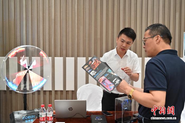 8月20日,十五运会和残特奥会广州赛区科技赋能+超级场景精准对接会在广州(国际)科技成果转化天河基地举行。图为参展商(左)向嘉宾介绍产品。中新社记者 陈楚红 摄