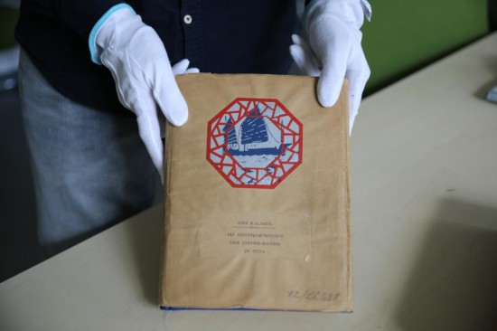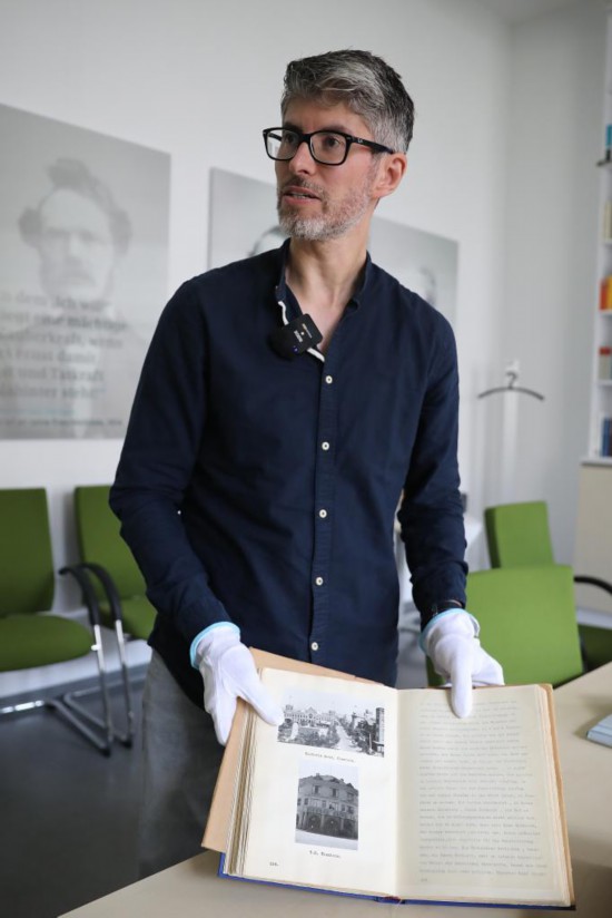 7月30日,在位于德国柏林的西门子历史档案馆,历史学家埃瓦尔德·布勒歇尔展示《拉贝日记》部分原件。新华社记者 杜哲宇 摄