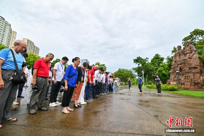 8月25日,海南海口,参加2025海外华文媒体海南采访行活动的海外华媒代表,与南侨机工、琼崖华侨回乡服务团后人等,向《南洋华侨机工回国服务团》《琼崖华侨回乡服务团》两座雕塑默哀、献花,追忆华侨回国支持抗战。中新社记者 骆云飞 摄