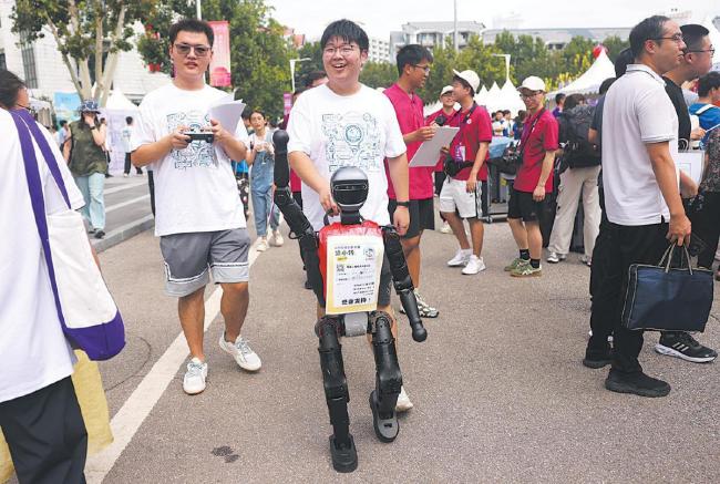今年的迎新队伍中还有一位特别成员——在首届人形机器人足球5V5比赛中夺冠的清华火神队机器人。它灵活地穿梭在人流中,身上贴着迎新指引。现场还有学生艺术团奉上军乐、民乐、合唱、相声等迎新节目,洋溢着热烈欢快的氛围。