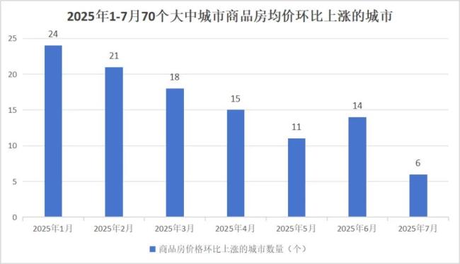 七月份,全国有6个城市新房价格环比上涨,分别为上海、乌鲁木齐、宜昌、三亚、长春、常德,涨幅分别为0.3%、0.3%、0.2%、0.2%、0.1%、0.1%,是今年以来房价上涨城市最少的一个月份。