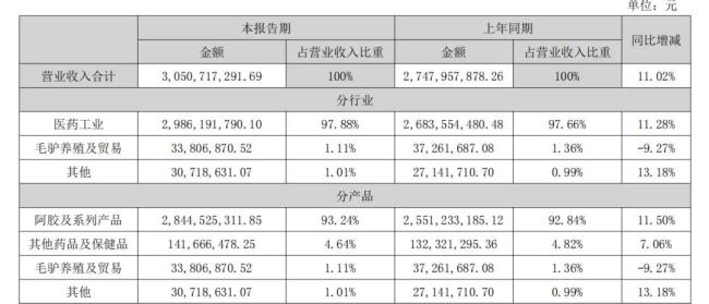 在程杰任期,东阿阿胶不再局限于单一产品依赖,着手构建“药品+健康消费品”双轮驱动业务模式,围绕大健康拓展新赛道、引进新产品。不过,分产品来看,阿胶及系列产品依然是东阿阿胶营收的大头,占总营收93.24%,同比增长11.50%。