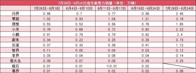另外,极石汽车上周销量重新增长至0.02万辆;7月28日-8月24日,极石累计销量约0.04万辆。
