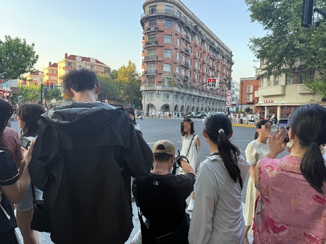 武康大楼位于淮海中路、武康路、兴国路、天平路与余庆路五路交汇处,车流、人流本就密集。记者近日多次走访发现,即便是工作日下午,原本不宽的人行道也常被人群挤满。过街时段,因拍照游客在路口停留,有时行人不得不绕行至车行道,随后又被市容管理人员劝导返回人行道。