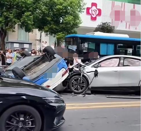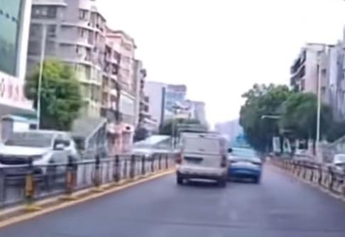 记者在这段视频中看到,通过一个路口后,出租车在右边行驶,一辆面包车从左侧进入了视频画面。因前方有行驶缓慢的公交车,视频中出租车可能有往左变道的想法,面包车当即出现一个加速的动作,因两车贴的太近,出租车只能回到原有车道,跟在了公交车后面。很快,出租车变道至左侧,又向右侧变道超越了公交车,超过那辆面包车后又迅速向左侧变道,面包车车头出现一个轻微往右“甩”的动作,结果直接将出租车顶翻。出租车冲破中央隔离护栏砸到了对向两辆车,之后完全翻了过来。在其它视频中,记者注意到,消防、交警和救护人员在现场施救。