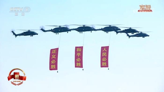 以本次阅兵为例,分列式中,多型直升机组成的空中护旗梯队以护卫旗帜、编成字符、悬挂标语等方式,率先通过天安门广场上空。