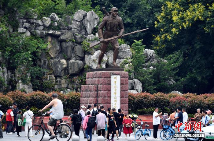 9月3日,在成都市人民公园川军抗日阵亡将士纪念碑前,市民和游人驻足瞻仰献花。图为市民在纪念碑前拍照。中新社记者 王磊 摄
