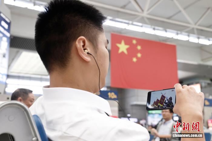 图为在铁路上海虹桥站候车大厅,旅客观看视频直播。中新社记者 殷立勤 摄