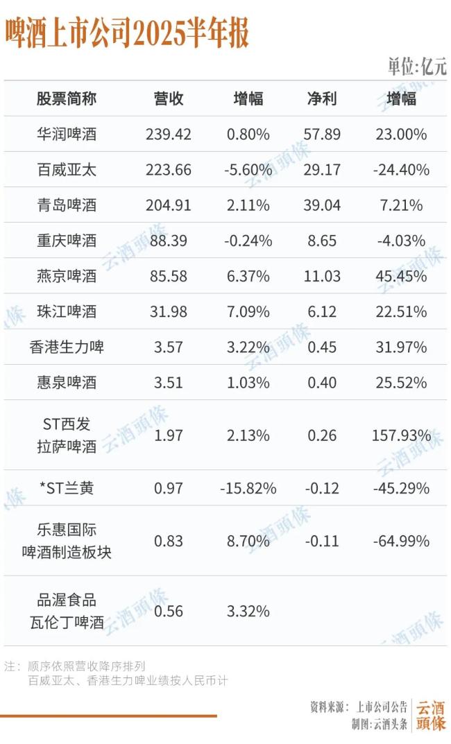 五家啤酒上市公司中,华润啤酒(营收增长0.8%、净利润增长23%)、青岛啤酒(营收增长2.1%、净利增长7.21%)、燕京啤酒(营收增长6.37%、净利增长45.45%)营收、利润均实现正增长,而百威亚太、重庆啤酒营收和净利润均下滑。