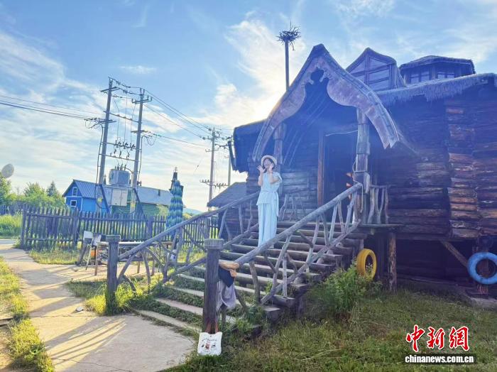 7月12日,内蒙古额尔古纳,游客打卡木刻楞传统建筑。中新社记者 张玮 摄