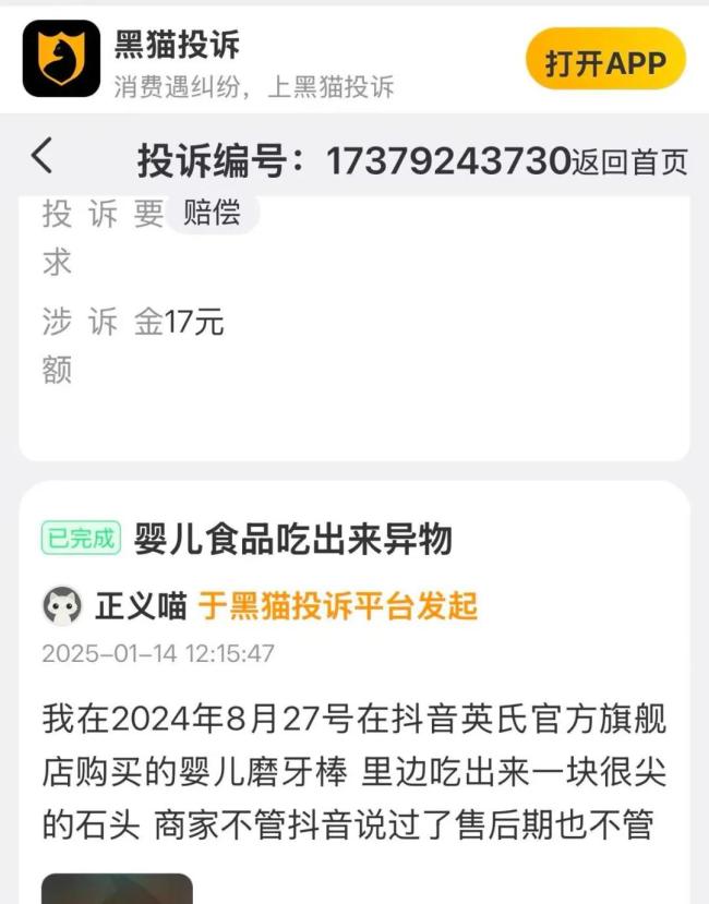 胡说有理注意到,黑猫投诉显示,截至9月5日,共有400多条投诉中包含搜索词“英氏”。