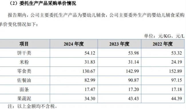 但再看饼干类、面条类产品采购价比较平稳,而零食类、佐餐油、果蔬泥产品均呈现逐年下降的趋势,这难免不让人生疑。