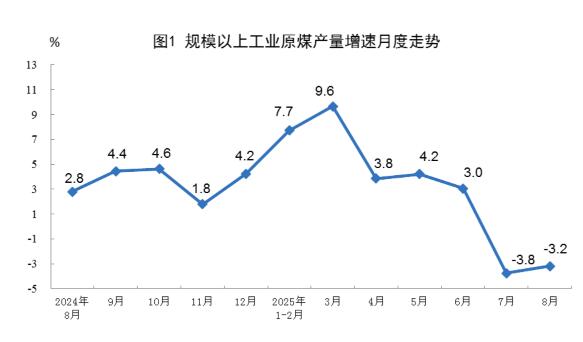 原煤生产降幅收窄。8月份,规上工业原煤产量3.9亿吨,同比下降3.2%,降幅比7月份收窄0.6个百分点;日均产量1260万吨。