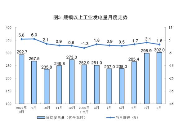 规上工业电力生产平稳增长。8月份,规上工业发电量9363亿千瓦时,同比增长1.6%;日均发电首次突破300亿千瓦时,达302.0亿千瓦时。1—8月份,规上工业发电量64193亿千瓦时,同比增长1.5%,扣除天数原因,日均发电量同比增长1.9%。