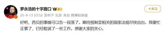 此前,9月13日晚,罗永浩曾发文表示“西贝的事情可以告一段落,期待预制菜相关的国家法规尽快出台。我要忙正事了,已经耽误了一些工作。”
