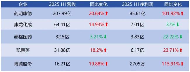 四哥凯莱英在上半年也实现了营收与利润双维度提升:营业收入为31.88亿元,同比增长18.20%;归母净利润为6.17亿元,同比增长23.71%。