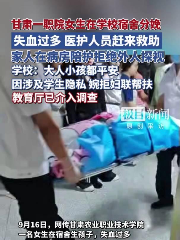 近日,甘肃农业职业技术学院一名女学生在学校宿舍分娩引发关注。9月13日,在该校1号公寓,医护人员怀抱新生儿,并用担架将女学生送至医院。