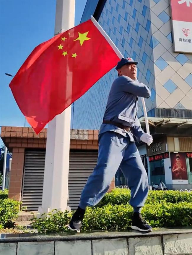 这位大爷名叫金先生,今年54岁,出生在辽宁,已在山东淄博定居多年。他表示,早上7时左右,他带着国旗和自制的宣传海报来到街头,持续到上午10时许才结束。谈及初衷,金先生一度哽咽,回忆起那个特殊年代的历史,他感到气愤又庆幸自己生活在和平年代,对革命先辈充满敬仰。尽管身体不错,但当天他感觉腿疼,回家后发现衣服湿透,脸上也有一层盐渍,应该是汗水干了。