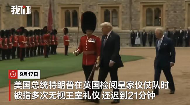 9月17日,美国总统特朗普在英国检阅皇家仪仗队时被指多次无视王室礼仪,并且迟到了21分钟。英国国王查尔斯三世举行欢迎仪式期间,特朗普两次拍打查尔斯三世的背。在检阅仪仗队时,特朗普大步走在前面与卫兵交谈,把查尔斯三世甩在后面。查尔斯三世仍走上前引导并提醒特朗普“小心剑”。