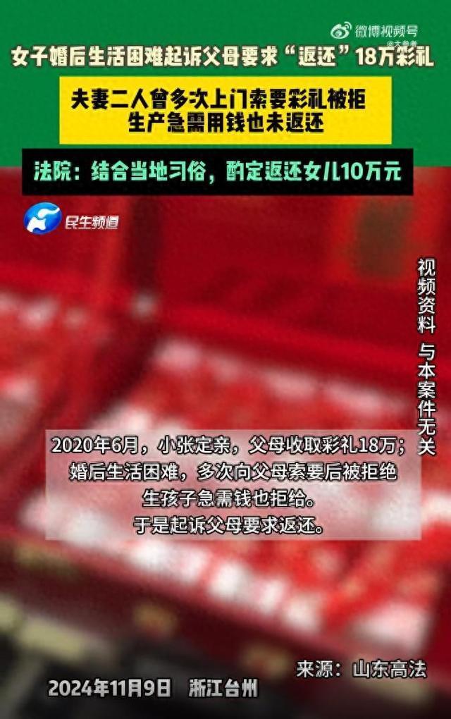 浙江一女子起诉父母:多次索要彩礼被拒 法院判决返还10万!浙江台州的小张在2020年6月与男方相亲后订婚。小张的父母向男方收取了18万元彩礼。婚后,由于丈夫家庭条件不宽裕,生活困难,小张多次向父母索要这笔彩礼以补贴生活开支,但均遭到拒绝。甚至在小张生产住院急需医疗费时,父母也不愿返还这笔钱。2024年,小张提起诉讼,要求父母返还18万元彩礼。