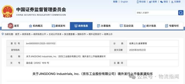 9月22日,中国证监会国际合作司发布关于JINGDONG Industrials,Inc.(京东工业股份有限公司)境外发行上市备案通知书,确认其通过境内运营实体北京京东数智工业科技有限公司提交的备案材料已收悉。根据备案文件,京东工业拟发行约2.533亿股普通股,并在香港联合交易所主板挂牌上市。(责任编辑:zx0600)