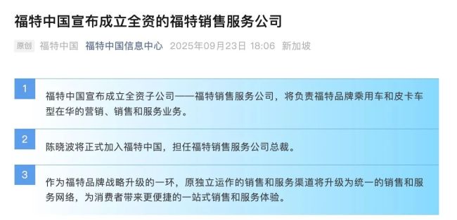 9月23日,福特中国发布公告称,其新的全资子公司——福特销售服务公司已经组建完毕,将于10月1日起正式运营,新公司负责福特品牌乘用车和皮卡车型在华的营销、销售和服务业务。