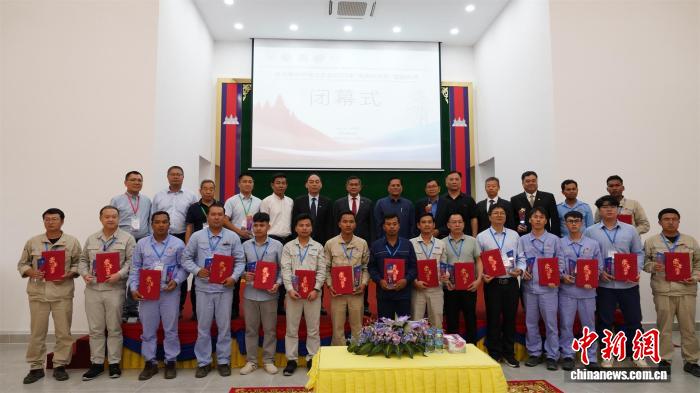 9月27日,2025年柬埔寨中资电力企业“电亮丝路杯”技能竞赛在菩萨省闭幕。图为获奖选手与颁奖嘉宾合影。张辉 摄