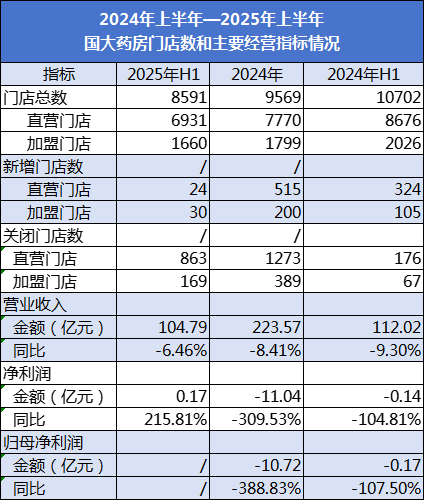 2024年底至2025年年初,国大药房在关闭门店方面祭出破釜沉舟的大招,先宣布关停安徽国大药房等3家子公司,接着对吉林成大、天津国大两家子公司破产清算,5家子公司共涉及100余家门店。国大药房默默地承受着关店带来的剧痛:2024年营业收入、归母净利润双降。2025年上半年,国大药房关闭亏损门店力度不减,彻底远离“万家门店”。