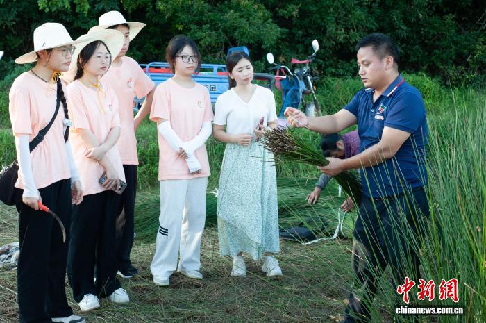 图为在江西省抚州市临川区河埠乡,严爱根为大学生实践团队介绍当地灯芯草种植情况。临川区委统战部供图
