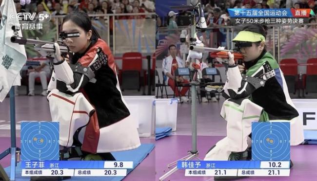 在单发淘汰赛中,韩佳予和王子菲表现出色。王子菲一枪打出10.6环,将自己的总成绩拉平到与韩佳予并列第一。此后,韩佳予连续多枪未能超过10环,被队友王子菲成功反超,最终错失加冕“三金王”的机会。王子菲也继韩佳予之后,夺得了本届全运会的个人第二金。
