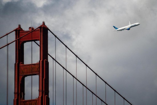 10月11日,一架美联航飞机在美国旧金山舰队周活动上进行飞行表演。新华社发(朱子于摄)