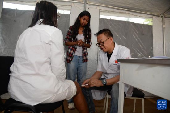 10月21日,在马达加斯加塔那那利佛北郊的阿努西亚拉医院,第24批中国援马达加斯加医疗队队员为当地民众义诊。新华社发(西塔卡·拉乔纳里松摄)