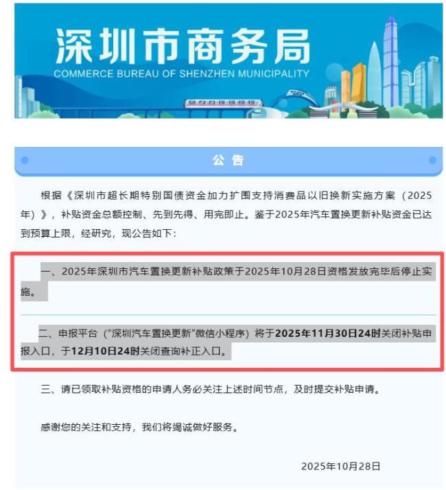 深圳停止汽车以旧换新补贴 资金用尽政策终止。10月28日,深圳市商务局发布通知,宣布2025年深圳市汽车置换更新补贴政策在资格发放完毕后停止实施。根据《深圳市超长期特别国债资金加力扩围支持消费品以旧换新实施方案(2025年)》,补贴资金总额有限,先到先得,用完即止。由于2025年的汽车置换更新补贴资金已达预算上限,该政策将在资格发放完毕后结束。