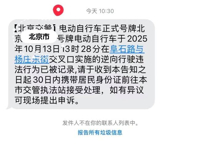 在某社交平台,有网友晒出10月14日收到的121231100号码显示为【北京交警】发送的短信,告知其电动自行车在阜石路与杨庄东街交叉口逆行被记录,需30日内携带身份证前往交管执法站接受处理,如有异议可现场提出申诉。该网友透露,她在执法站看到了探头拍摄的清晰违法照片,该违法行为被交管部门处以罚款20元,且已关联她本人的证件信息。但此次违法行为是由其家人造成的,这种情况是否应由违法者本人处理,工作人员也不清楚。该网友提醒其他驾驶员:处理违章需携带本人身份证和电动自行车行驶证,如果行驶证遗失,需补办后再接受处罚。
