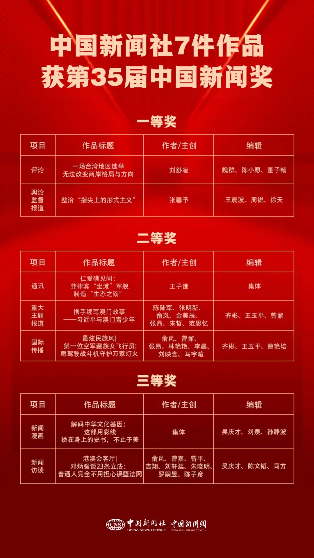 11月5日,第35届中国新闻奖揭晓。中国新闻社7件作品获奖,其中,一等奖2个,二等奖3个,三等奖2个。获得一等奖的作品为:评论《一场台湾地区选举无法改变两岸格局与方向》、舆论监督报道《整治“指尖上的形式主义”》。