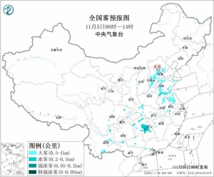 中央气象台今晨还发布了大雾黄色预警。预计,11月5日早晨至上午,北京东南部、天津中西部、河北中南部、山东西部和南部、江苏中北部、安徽北部、湖南中北部等地的部分地区有大雾,局地有能见度不足200米的强浓雾。
