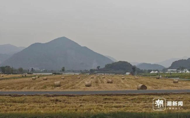 最近,有网友发现同款“瑞士卷”出现在杭州西湖区双浦镇。这些草垛位于铜鉴湖花海旁边,共有470余亩稻田。上百个圆滚滚的“瑞士卷”随意散落在稻田间,十分壮观。每卷草垛有半人多高,外面用一层白色的细网紧紧缠绕,确保草垛稳定。
