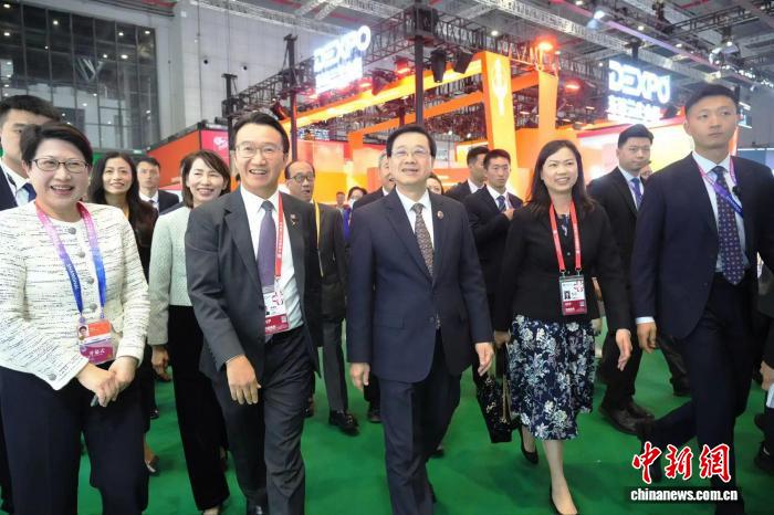 11月5日,香港特区行政长官李家超率领特区政府代表团出席第八届中国国际进口博览会,并到香港展馆参观。中新社记者 张亨伟 摄