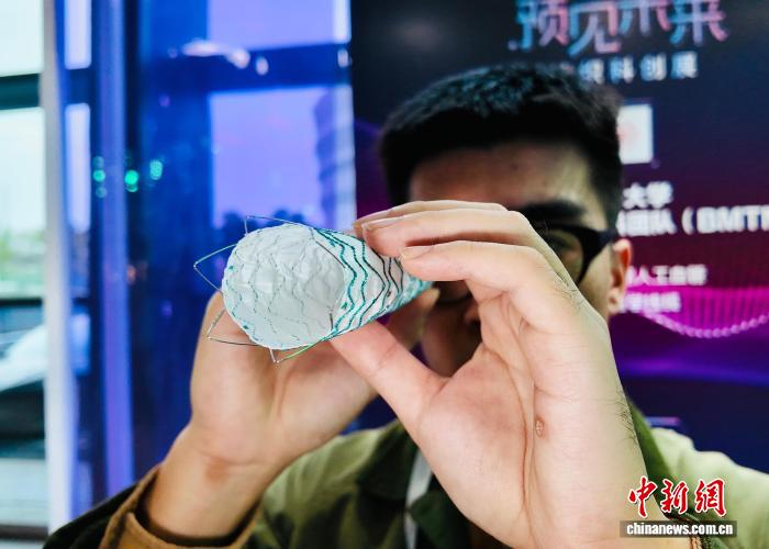 11月5日,东华大学生物医用纺织材料团队工作人员展示一款国产微创介入用人工血管。中新社记者 张斌 摄