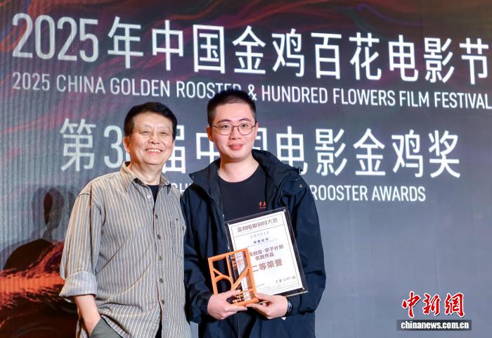 11月12日晚,2025年金鸡报晓仪式暨国贸之夜在福建厦门举行。活动旨在为青年影人铺路,为优质项目搭台,现场揭晓金鸡创投“高校联盟学子计划”等各项荣誉。图为导演黄建新(左)与获奖青年影人合影。中新社记者 王东明 摄