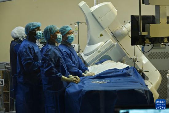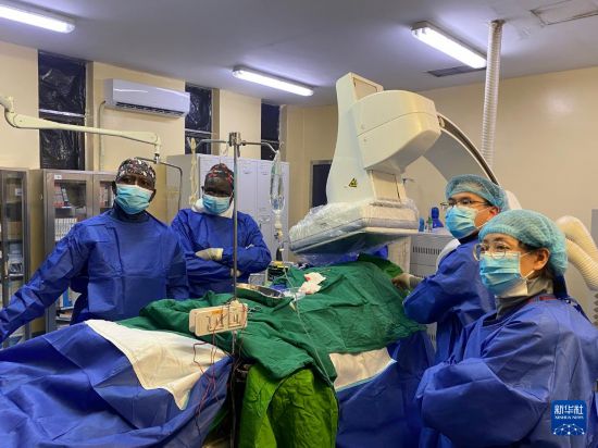 11月18日,在尼日尔尼亚美,广西壮族自治区人民医院心血管内科专家组为患者开展永久心脏起搏器植入术。新华社发(第24批援尼日尔中国医疗队供图)