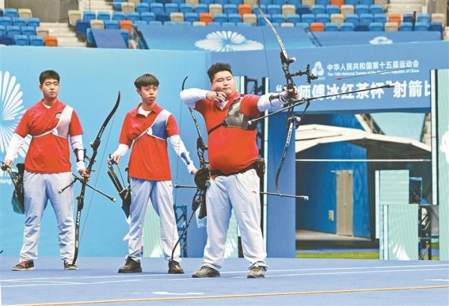 作为东道主选手,林良文与队友在主场观众的助威声中踏上赛场。铜牌赛采用局胜制,每局3名选手各射两箭,环数累加决出单局胜负,先得5分者获胜。首局较量中,湖北队凭借精准发挥先下一城。关键时刻,林良文率先打破僵局。第二局他射出10环及9环的成绩,带动队友合力扳平比分至2∶2。此后双方陷入胶着,比分来到4∶4,比赛进入决胜局生死战。决胜局中,林良文稳稳发挥打出9环,帮助广东队最终以5∶4锁定胜局。